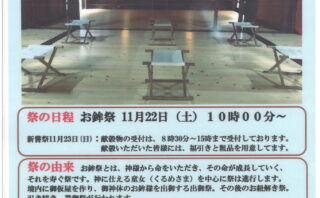 祭の日程 ♦お鉾祭 11月22日(土)10時00分~ ♦新嘗祭 11月23日(日):献穀物の受付は、8時30分~15時まで受付しております。献穀いただいた皆様には、福引きと粗品を用意してます。 大神神社 所在地 栃木市惣 […]