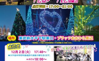 日時 2025年12/2(火)~2026年1/12(月・祝) 点灯時間 17:00~21:00 場所 東武新大平下駅東口・プラッツおおひら周辺 点灯式 12月2日(火) 17:40~ 点灯は18:00~ 詳細・お問い合わ […]