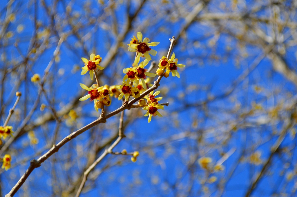 ロウバイは見頃継続、マンサク、アセビ、紅梅は開花が進み、白梅は一部で開花が始まりました。