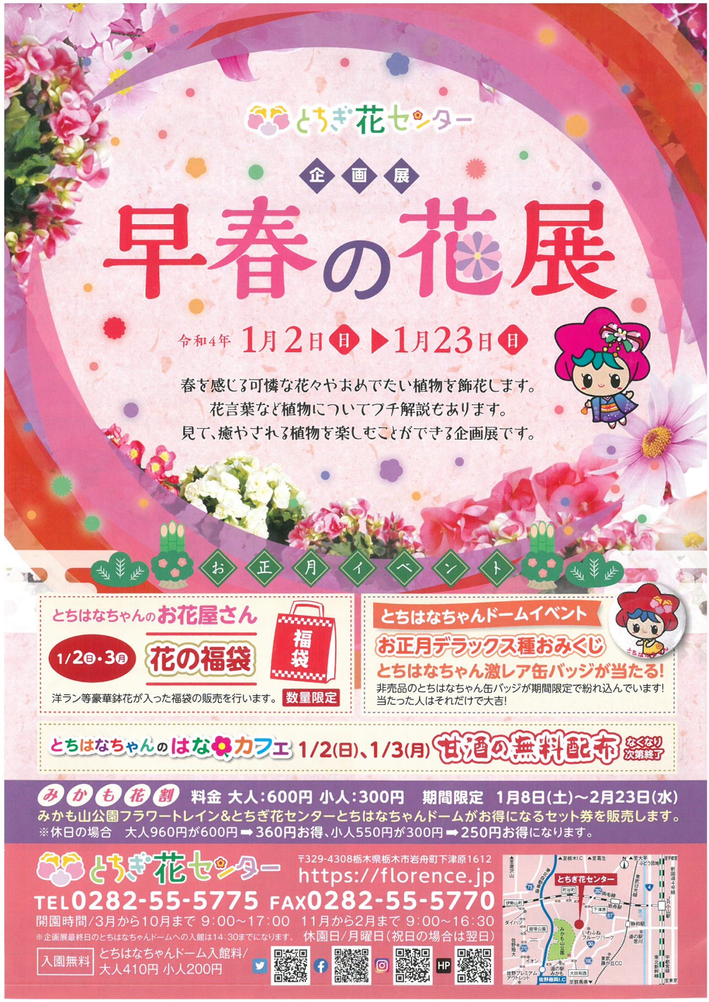 2021年12月24日 【とちぎ花センター】企画展早春の花展のお知らせ 南エリア 体験 おみやげ・買物 観光 お知らせ この記事は2021年12月24日に書かれました。現在は情報が異なる場合がございます。 ダウンロードはこちら⇒早春の花展 ダウンロードはこちら⇒1月体験教室のお知らせ