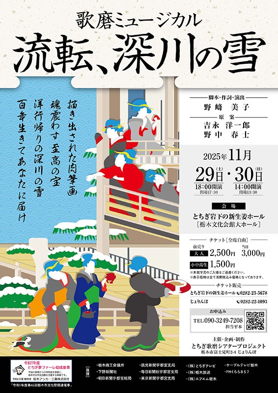 2025年11月19日 【歌麿ミュージカル 「流転、深川の雪」】のお知らせ 中央エリア 体験 お知らせ 開催日 •11/29(土) 18:00開演 17:30開場 •11/30(日) 14:00開演 13:30開場 公演会場 とちぎ岩下の新生姜ホール (栃木市栃木文化会館大ホール) 詳細・チケット販売・お問い合わせ↓