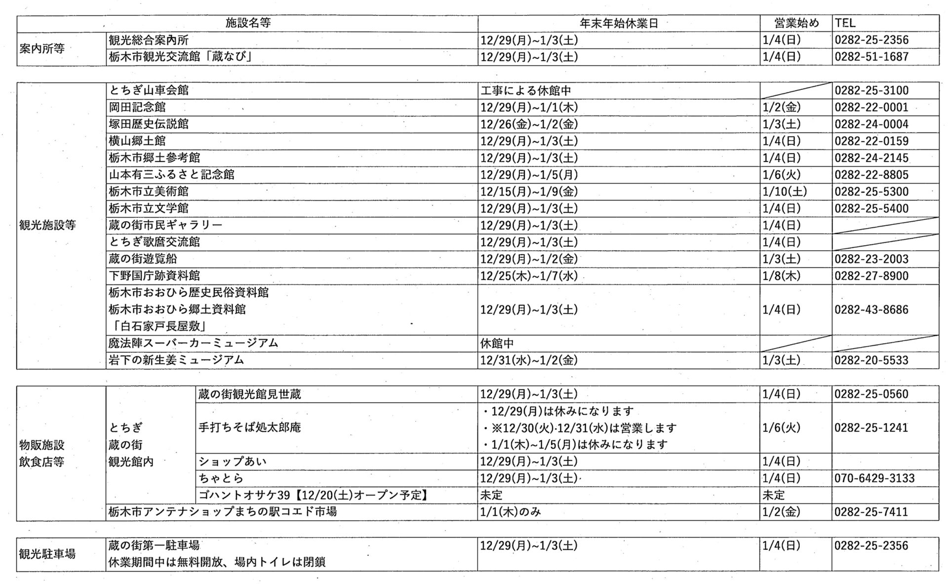観光施設等の年末年始休業期間について、下記表の通りお知らせいたします。