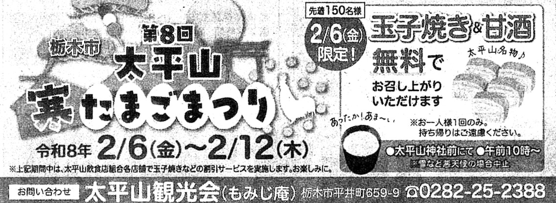上記期間中は、太平山飲食店組合各店舗で玉子焼きなどの割引サービスを実施します。