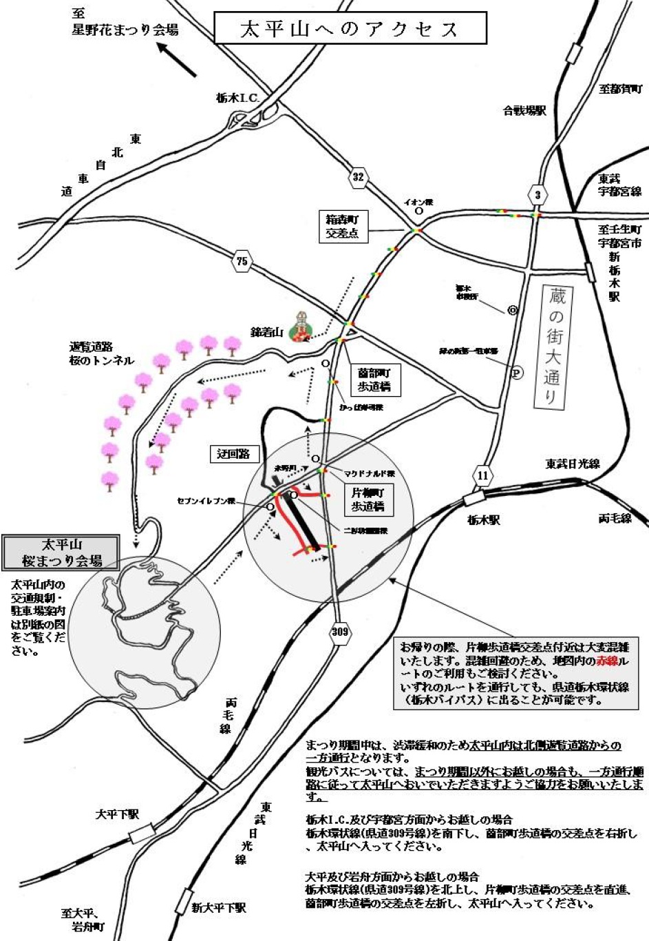 •渋滞が予想されますので、JR・東武栃木駅から路線バスのご利用もご検討ください。