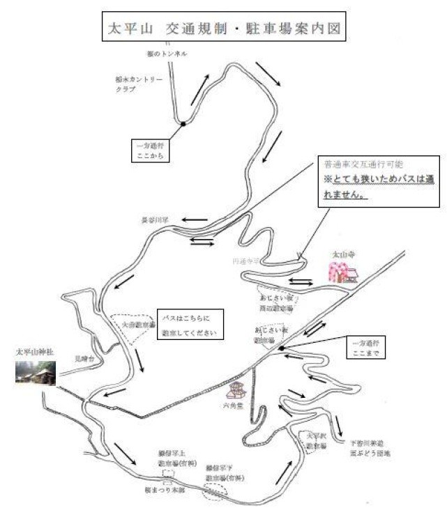 下図参照↓•期間中は渋滞緩和のため、太平山内は北側遊覧道路からの一方通行となりますが、観光バスについては、交通規制前にお越しの場合も、一方通行順路に従って太平山へおいでいただきますようご協力をお願いいたします。