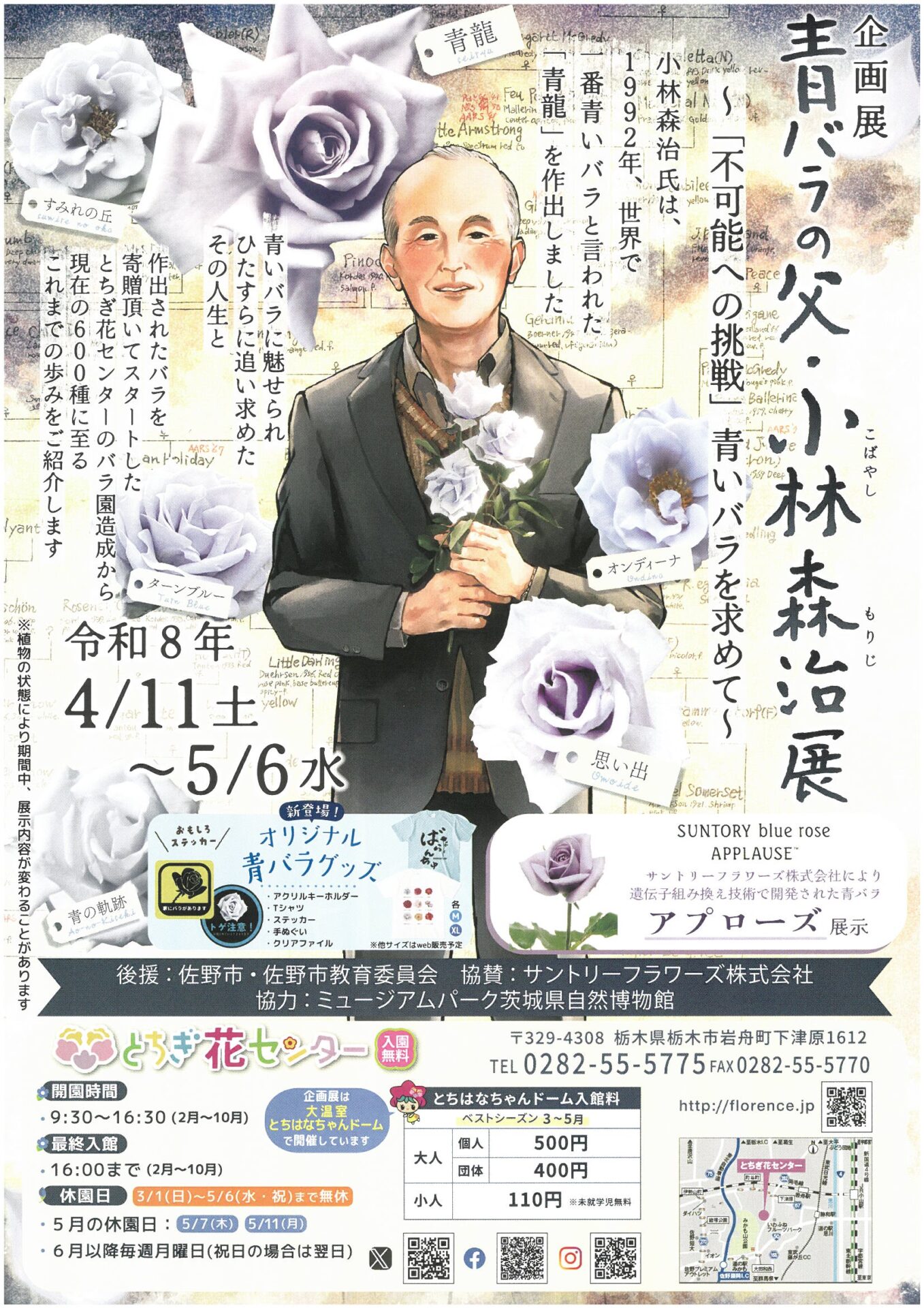 平成4年に開園したとちぎ花センターのバラ園開設(平成19年)のきっかけとなった人工交配による青いバラの育種にすべてをかけた小林森治氏(佐野市出身、2006年没)の偉業と小林森治氏が作出した14種のバラ全てを、5月から始まるローズフェスタに先駆けて紹介します。