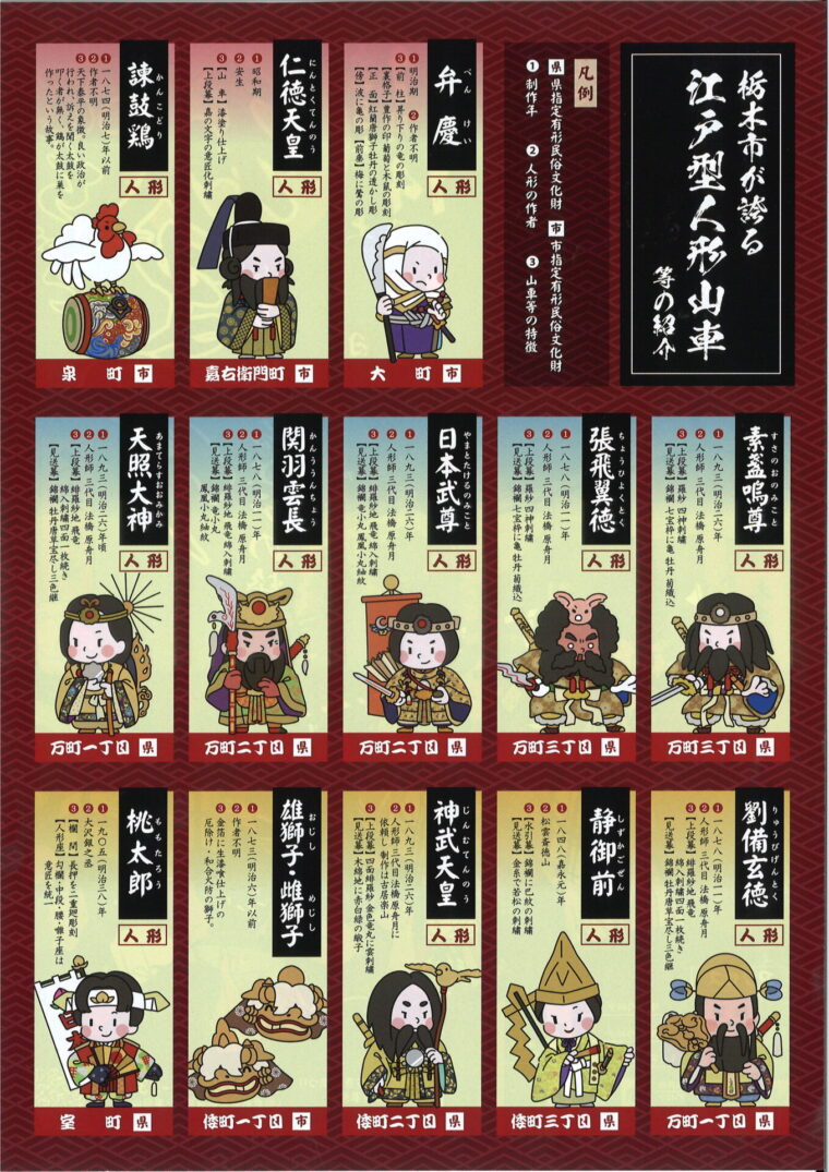 とちぎ秋まつりは、明治7年(1874)栃木県庁構内で行われた神武祭典を起源とし、明治26年(1893)栃木県最初の商業会議所開設認可に係る祝典では、万町一丁目・二丁目・三丁目、倭町二丁目・三丁目及び泉町の6台の山車が参加し、さらに明治39年(1906)神明宮・招魂社祭典では、室町の山車が参加して現在の祭りの形が出来上がったとされています。昭和12年(1937)の市制施行祭以降は、市の発展の祭礼として曳き出され、今日では、2年に一度、11月に栃木市の象徴である蔵造りの街並みを舞台に、江戸・明治時代に作られた絢爛豪華な江戸型人形山車が華やかに市内を練り歩きます。