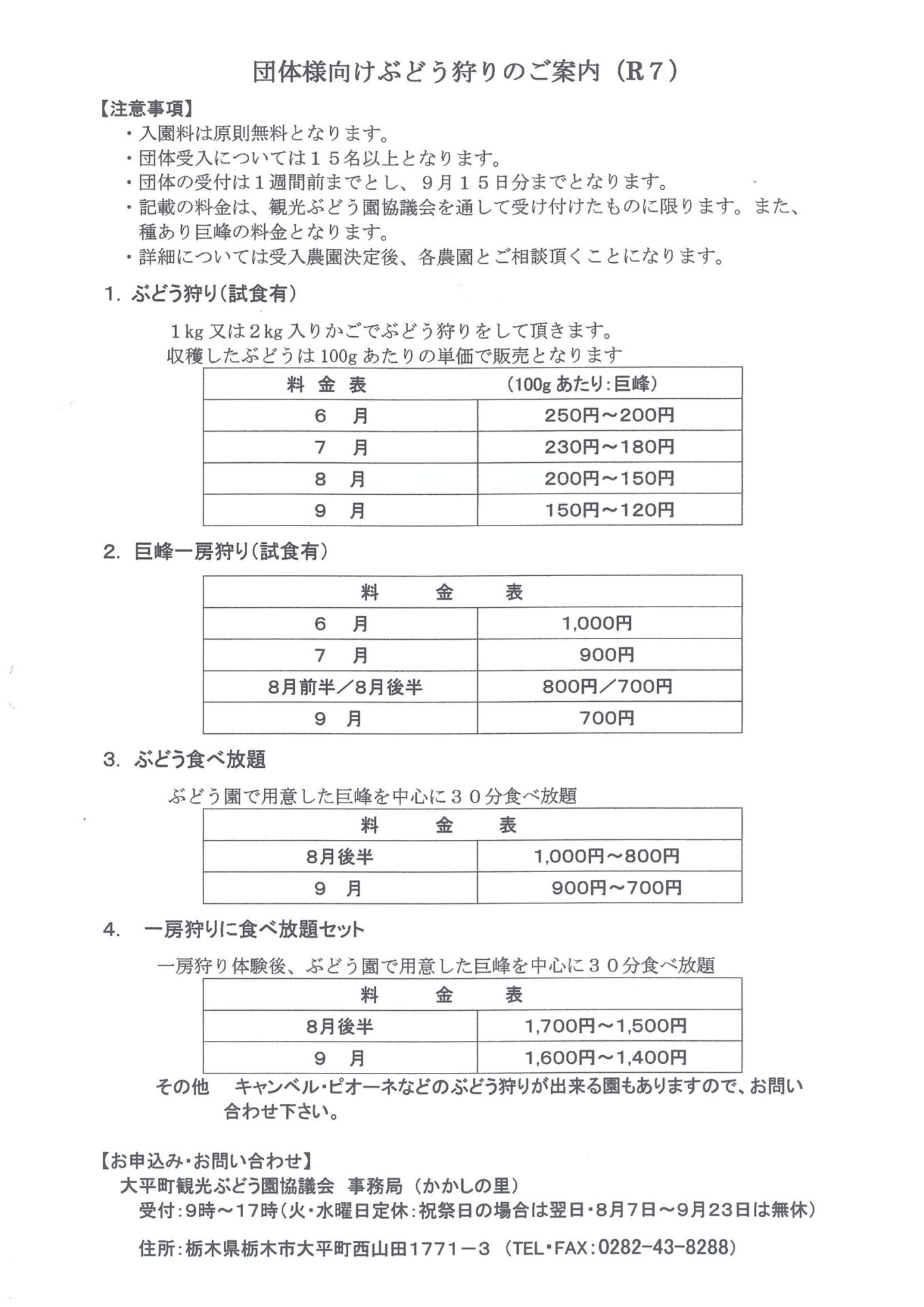 ・団体様用(15名以上)料金表 ☆団体様向けぶどう狩りのご案内(R7)☆